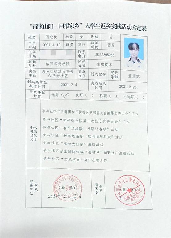 闪欣悦,河南省焦作市山阳区人,信阳师范学院必赢bwin官方网站2019级生物技术二班学生,任班级团支书一职,在寒假期间,新冠肺炎弥留之际,主动申请参加到焦作市山阳区东方红社区疫情防控的工作,并参与到焦作团市委的“青睐山阳,家乡”大学生寒假返乡实践暨助力疫情防控志愿服务活动。主要负责社区人员返乡登记、志愿者注册工作、为社区群众服务、推广金钟罩防诈骗系统以及宣传防控疫情知识等工作。