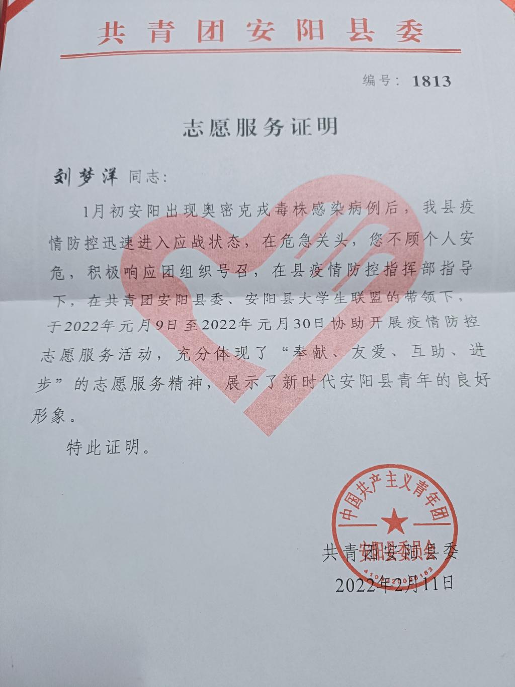 作为新时代青年大学生,刘梦洋同学用自己的行动践行着当代青年的使命。他加入了家乡安阳县大学生志愿者联盟,积极响应政府号召,多次参与当地志愿者活动,在行动中诠释青春诺言。2021年年末,突如其来的疫情席卷河南安阳,疫情就是命令,防控就是责任,刘梦洋和青年志愿者们一起戴上口罩,穿上红马甲,积极投入家乡的疫情防控工作中,用手机给居民录入信息,引导群众按流程和要求进行测温验码、消毒登记、引导返乡人员和外来人员进行信息登记、宣传防疫知识。以自身良好形象和模范行动,在平凡的岗位上用不平凡的奉献传递抗疫正能量,为打赢疫情防控阻击战贡献青春力量,彰显了青年大学生的责任担当。
