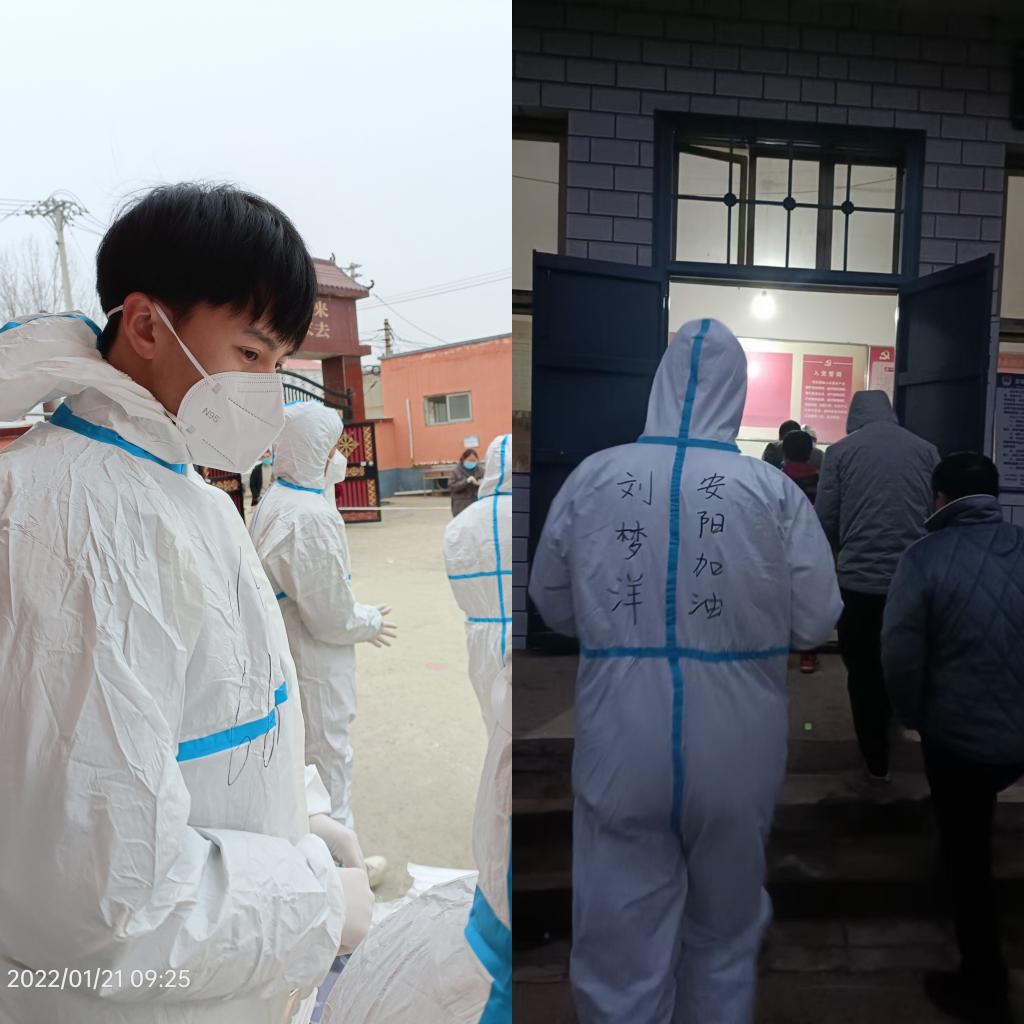 刘梦洋,河南省安阳市安阳县大学生联盟成员,信阳师范学院必赢bwin官方网站2021级土木工程一班学生。2021年末寒假期间,他投身到当地抗疫志愿服务队,积极参与到社区抗疫志愿工作中,与当地社区干部和大学生志愿者们共同筑成了守护安阳的一面防疫铁墙。