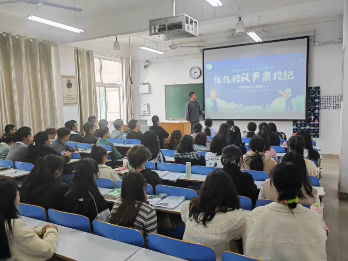 知规守纪,载梦而行。各班以主题班会形式,各班班长为主讲人,以《校规校纪手册》为基础,从学习纪律、校园纪律、宿舍纪律、文明礼仪等方面出发,以宿舍规定以及教育管理为重点注意事项,以违规行为举例、违规处罚为内容进行仔细解读,提醒同学们“何可为、何不可为、何必为”。同学们表示通过学习更加明确学校的规章制度,在以后的生活中一定做讲文明、树新风、懂纪律、守规矩的大学生,心怀远大理想,勇攀学业顶峰,脚踏实地,将校纪校规内化为自觉追求,外化为自觉行动。