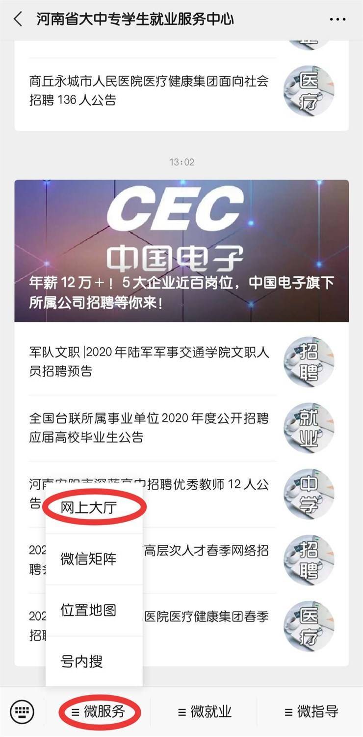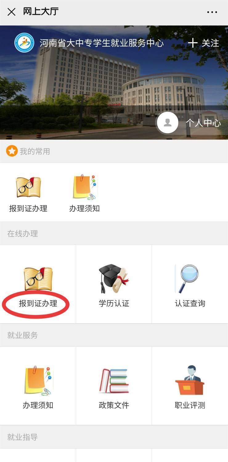 第一步:请学生关注“河南省大中专学生就业服务中心”微信公众号,关注后点击“微服务”—“网上大厅”—“报到证办理”先注册账号(手机号注册),然后进行所需要的业务办理。