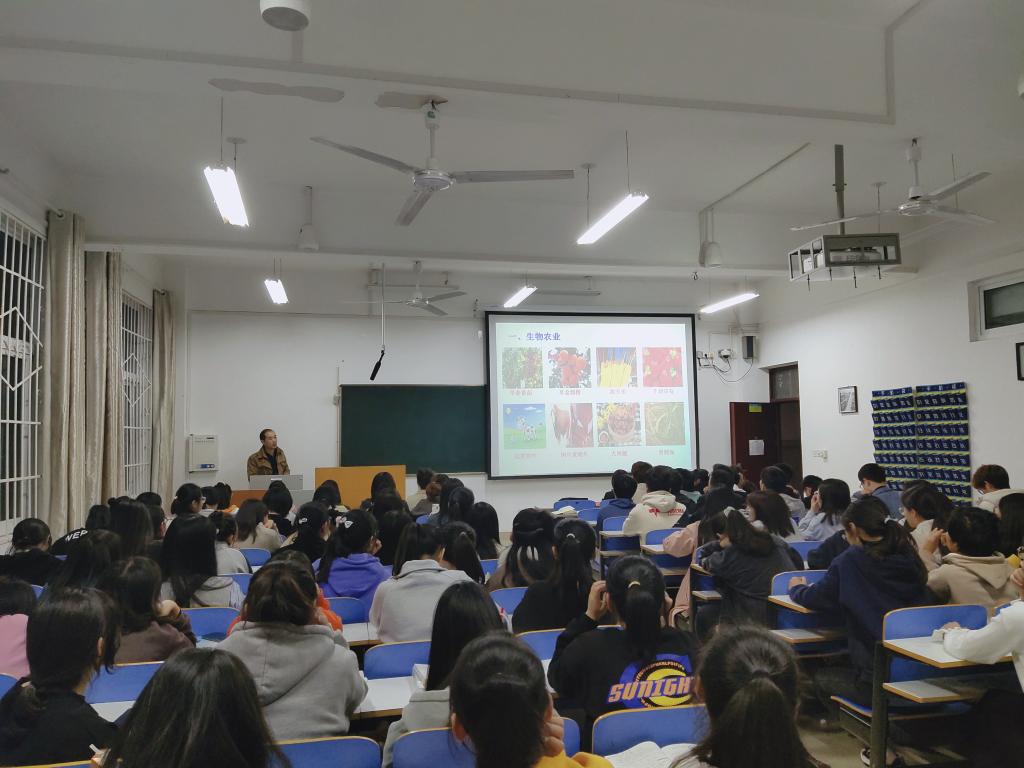周棋赢围绕专业基本情况、就业前景、科学研究等进行了介绍。他重点讲述了党和国家关于支持生物技术专业发展的优惠政策,从生物农业、生物制药、生物能源、生物保健、生物化工、生物服务等方面向同学们讲述了生物技术的就业前景,内容详实,素材丰富,加深了同学们对专业知识的了解,坚定了同学们的专业信心。他指出,希望同学们坚守初心,保持对知识学习的热忱,脚踏实地,做一名有情怀的大学生。