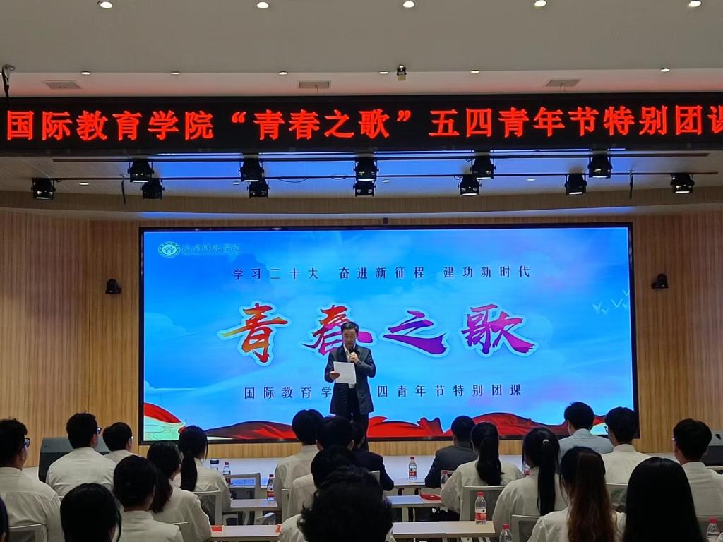 在第74个五四青年节到来之际,为深入学习贯彻党的二十大精神,落实立德树人根本任务,引导广大青年自觉践行习近平总书记对广大青年的殷殷嘱托,树正价值观念,立志听党话、跟党走,使党的政策主张切实转化为投身民族复兴伟业的自觉行动,5月4日上午,必赢bwin官方网站党委在博雅讲堂举办“青春之歌”五四特别团课活动。校党委副书记、工会主席岳宗德、校团委副书记张鹏、商学院副院长俞彤辉、必赢bwin官方网站领导班子成员、博士教师张雨雪、全体辅导员和优秀共青团员代表参加活动。